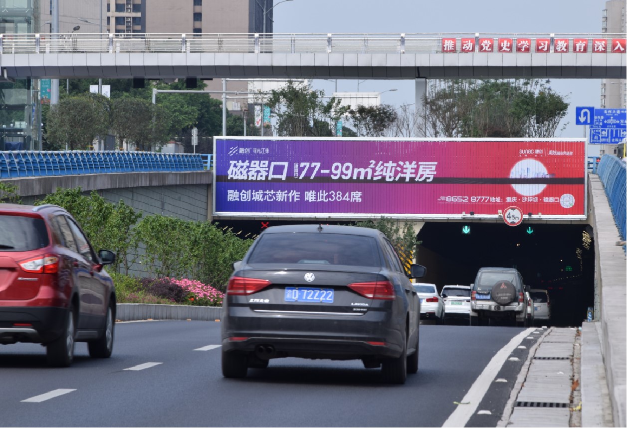媒體位于金開大道愛琴海購(gòu)物公園下穿道,周邊約有100萬(wàn)常住客群,40多個(gè)高端住宅,核心輻射周邊5—10公里范圍內(nèi)的家庭消費(fèi)及商務(wù)人群、250萬(wàn)人口;次級(jí)輻射渝北、江北等主城300萬(wàn)商務(wù)人群。媒體位于下穿隧道兩端,離地近,面積大,可雙向覆蓋空港新城、鴛鴦、金州板塊至三北核心的上下班車流。