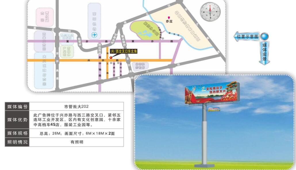 | 亦莊單立柱廣告 媒體位置: ?①五環(huán)路與榮華橋交界處東西兩側(cè) 媒體規(guī)格:18m*6m*3面 ? ?②亦莊西環(huán)路與榮京西街交界處南北兩側(cè) ?③亦莊西環(huán)路與榮昌西街交界處南北兩側(cè) ④亦莊東區(qū)科創(chuàng)五街與經(jīng) 海一路交界處兩側(cè) |
