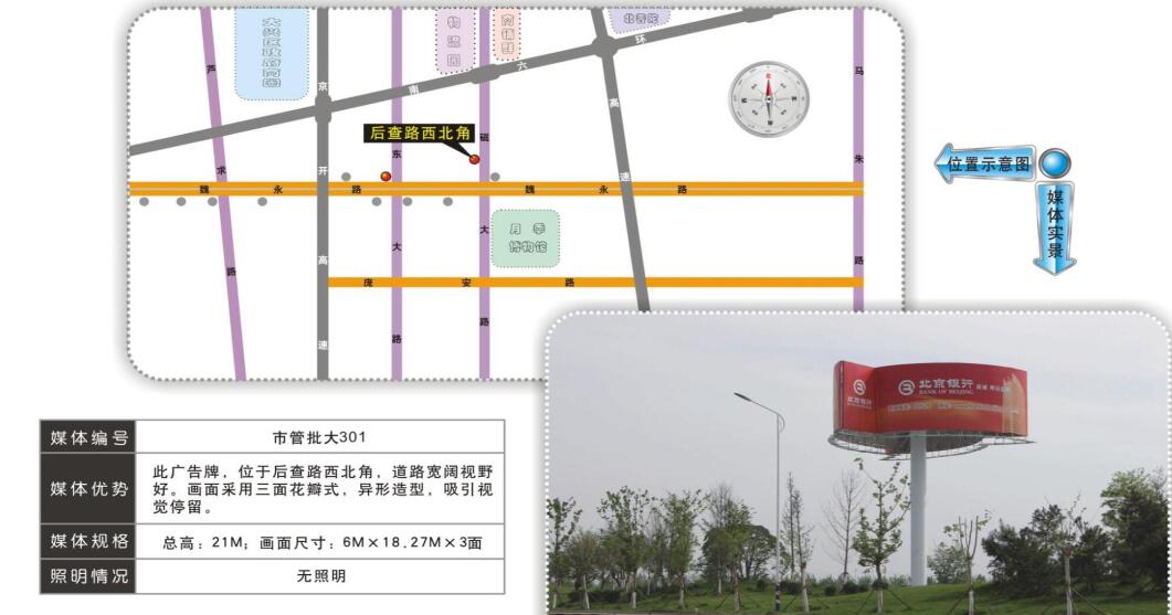 | 亦莊雙面單立柱廣告 媒體位置:榮華北路、榮華南路、西環(huán)北路、東區(qū)科創(chuàng)五街 媒體規(guī)格:12m*4m*2面 |