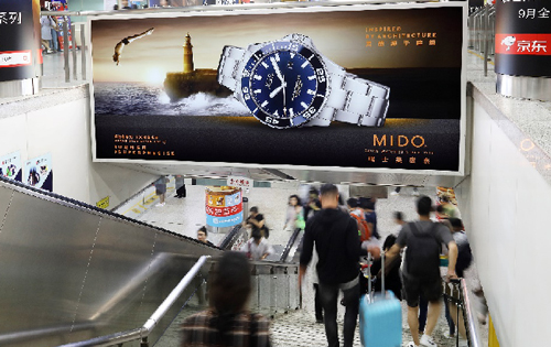 | 創(chuàng)意媒體-南京地鐵新街口站14號品牌通道廣告 線路:1、2號線 組合形式:130㎡梯側(cè)貼 媒體費(元/52周):380,000 制作方式:寫真噴繪 制作費(元/次):39,000 |