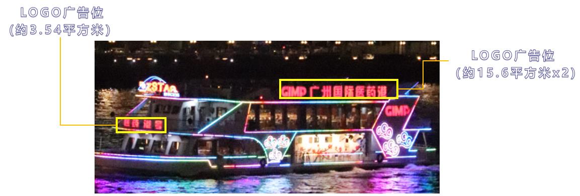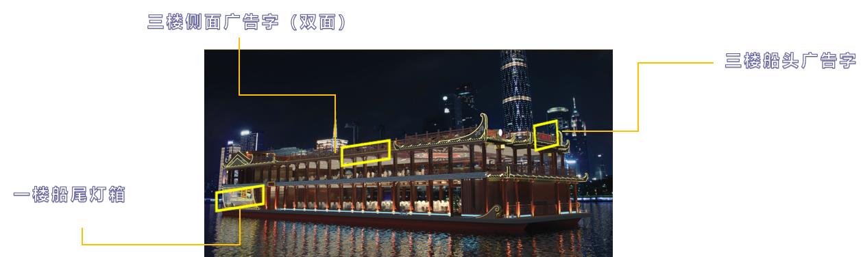 | 媒體尺寸 | 船身外側廣告字:長-7米、高-0.9米;船頭橫幅廣告位:長-10米,高-1米; 一樓內部整面廣告墻:長-3.4米,高-2.8米。 |