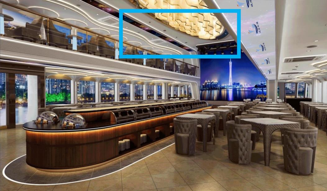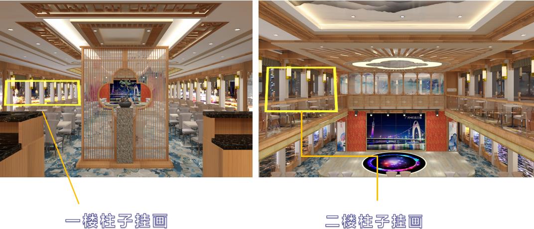 游船內部廣告位:一樓及二樓開放式坐席區兩側分布2個長條狀廣告展示位,共4個。