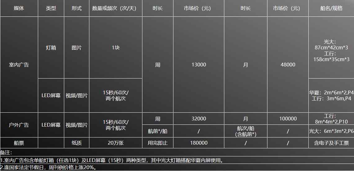 媒體形式:視頻循環播放(最少60次/天/船,片長10分鐘內)