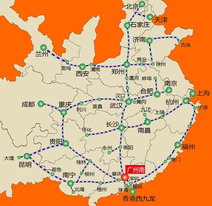 中國鐵路廣州局集團有限公司管轄的特等站,是華南地區最繁忙的高鐵站。 廣州南站連接京廣高速鐵路、廣深港高速鐵路、貴廣高速鐵路、南廣鐵路、廣珠城軌和粵西沿海鐵路,是粵港澳大灣區、泛珠江三角洲地區的鐵路核心車站,是廣州鐵路客運樞紐的站點之一。 每日均到發列車808列次,均為高鐵動車,可直達北京、上海、杭州、深圳、南京、武漢、長沙、鄭州、宜昌、岳陽、西安、合肥、南昌、成都、貴陽、南寧、桂林、濟南、青島、上饒、石家莊、太原、新會、信陽、珠海等經濟發達城市。 現每日開行列車可以輻射到環渤海經濟圈、中部經濟圈、長三角經濟圈、珠三角經濟圈、西南經濟圈、海峽經濟圈、西北經濟圈共七大經濟圈。 |