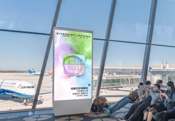 機場電視、刷屏機廣告是機場中數(shù)字化戶外媒體的常見廣告形式,一般形態(tài)是落地立式刷屏機、懸掛電視,廣泛分布在機場、地鐵站、樓宇電梯等候區(qū)等公共場所,采用終端聯(lián)網(wǎng)控制的特性讓廣告可實現(xiàn)實時播放控制。在人流量密集的場所刷屏機擁有的聲音+視頻動態(tài)傳播的效果可使廣告具備更高的吸引力。