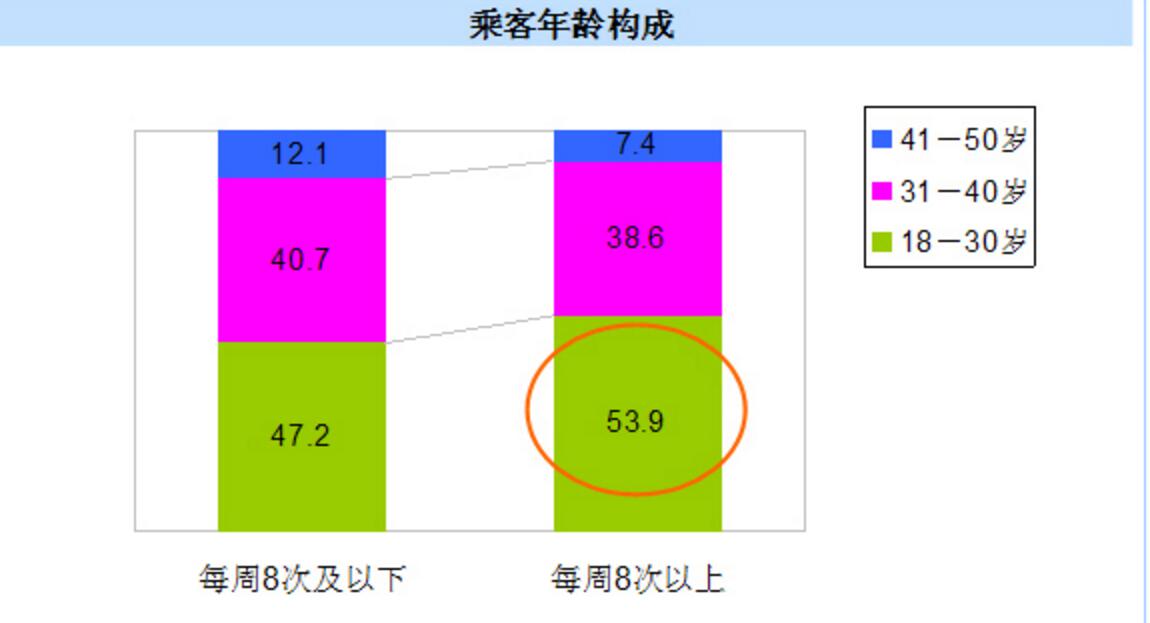 每周乘坐8次以上的乘客中,超過半數是18-30歲的年輕人。處于這一年齡段的人具有極強的消費欲望,也是時尚潮流的引領者。
