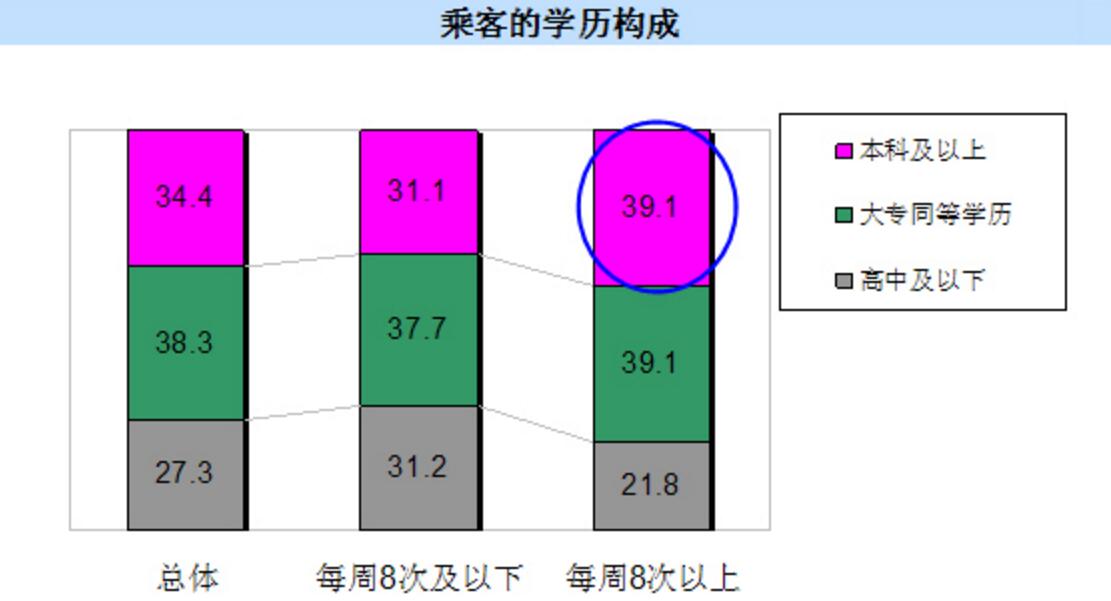 每周乘坐8次以上的乘客中,本科以上學歷乘客比例高達39.1%,高學歷的乘客往往擁有更高的收入和消費能力。
