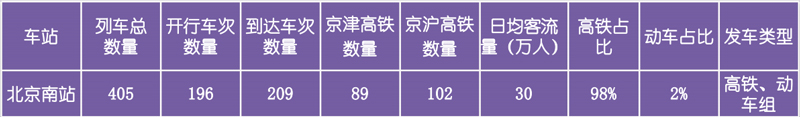 北京南站高鐵數(shù)量占比98%,動(dòng)車數(shù)量占比2%。通過對(duì)比顯示,北京南站發(fā)送列車主要以高鐵列車為主,包含京津城際、京滬線、部分京哈線。