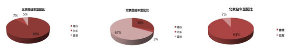 2、北京西站,高鐵數(shù)量占比67%,勱車數(shù)量占比30%,普速列車數(shù)量占比3%。通過(guò)對(duì)比顯示,北京西站發(fā)送列車主要以高速列車,勱車為主,包含京原線、京九線、京包線、京廣線