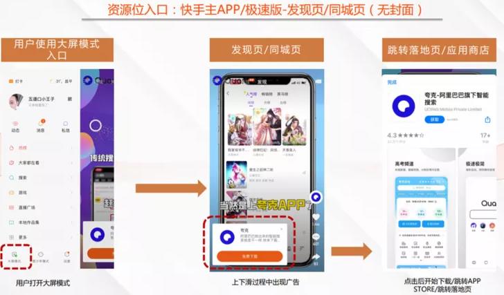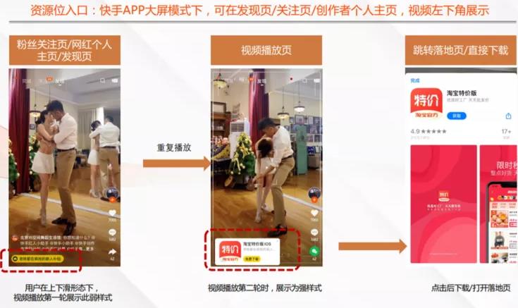快手APP信息流廣告位在發(fā)現(xiàn)頁(yè)第五/六位,短視頻播放過(guò)程中可點(diǎn)擊下方行為按鈕,到達(dá)落地頁(yè)、淘寶APP,或者跳轉(zhuǎn)到應(yīng)用市場(chǎng)。