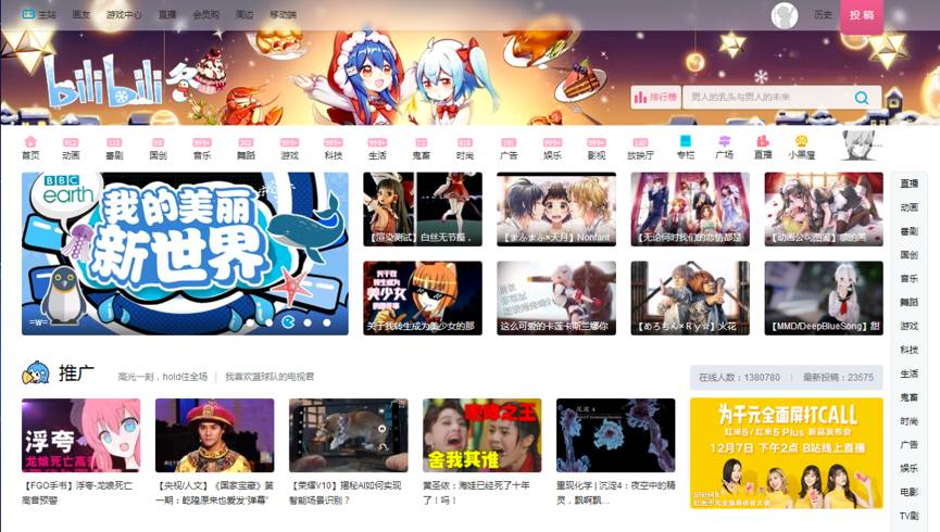 bilibili目前擁有動畫、番劇、國創(chuàng)、音樂、舞蹈、游戲、知識、生活、娛樂、鬼畜、時尚、放映廳等 15 個內(nèi)容分區(qū),生活、娛樂、游戲、動漫、科技是B站主要的內(nèi)容品類并開設(shè)直播、游戲中心、周邊等業(yè)務(wù)板塊。?