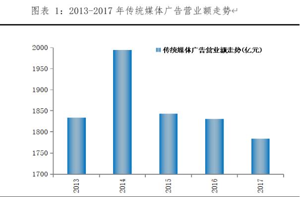 各企業對廣告投放也不再停留傳統的廣告投放模式,而是尋找用戶心理訴求,打造個性化廣告投放效果。由國家工商總局統計數據,我國傳統媒體的廣告收入從2013年開始出現斷崖式下滑。2013年,電視廣告收入為1101.1億元,同比下滑2.76%;報紙廣告收入為504.7億元,同比下滑9.16%,四大傳統媒體廣告收入之和為1834.18億元,同比下滑4.09%。雖然2014年轉為正增長,傳統廣告媒體營業額上升至1994.63億元,但在這之后又開始了連續三年下滑。