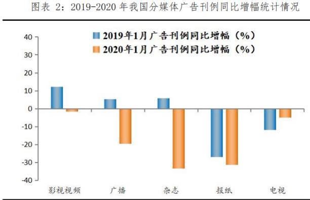 目前,分媒體來看,傳統廣告媒介主要包括影視媒體、報紙媒體、雜志、廣播和電視等。2020年1月,報紙、雜志、廣播等較為傳統的廣告媒介刊例下降幅度較大,報紙、雜志等紙媒下降了將近30%以上,廣播媒介與電視下降了19.5%和4.9%。整體而言,傳統媒體廣告刊例花費呈下降趨勢,報紙、雜志等紙媒首當其沖,其次廣播媒介,最后電視及影視媒介。
